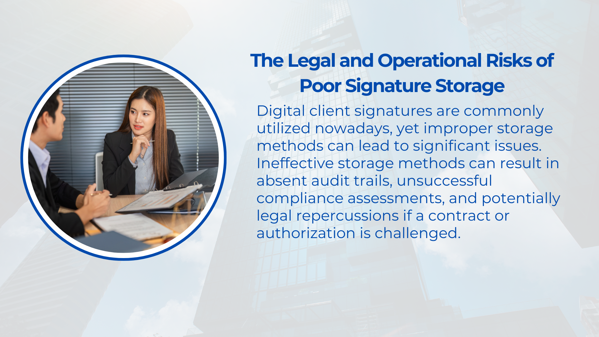 Digital client signatures are commonly utilized nowadays, yet improper storage methods can lead to significant issues. Ineffective storage methods can result in absent audit trails, unsuccessful compliance assessments, and potentially legal repercussions if a contract or authorization is challenged.