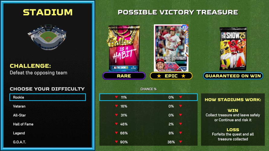 To unlock the special rewards, you must successfully complete a stadium challenge—a short, three-inning game—at the conclusion of your chosen quest. The likelihood of obtaining rare or epic rewards depends heavily on the difficulty level you select for this challenge. Higher difficulties generally improve your chances. During the quest selection screen, you can view detailed reward probabilities by clicking on the "see reward breakdown" option at the bottom of the menu. For example, selecting rookie difficulty might give you only a 2% chance at an epic reward, whereas choosing G.O.A.T. difficulty can boost your odds to around 70%.