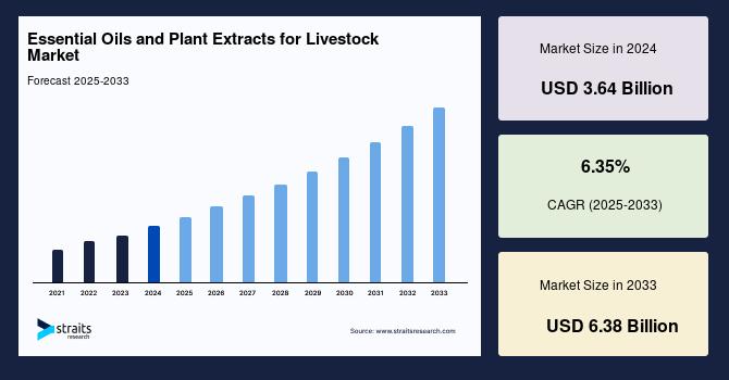 According to StraitsResearch, the global essential oils and plant extracts for livestock market size is valued at USD 3.64 billion in 2024 and is estimated to reach USD 6.38 billion by 2033, growing at a CAGR of 6.35% during 2025-2033.