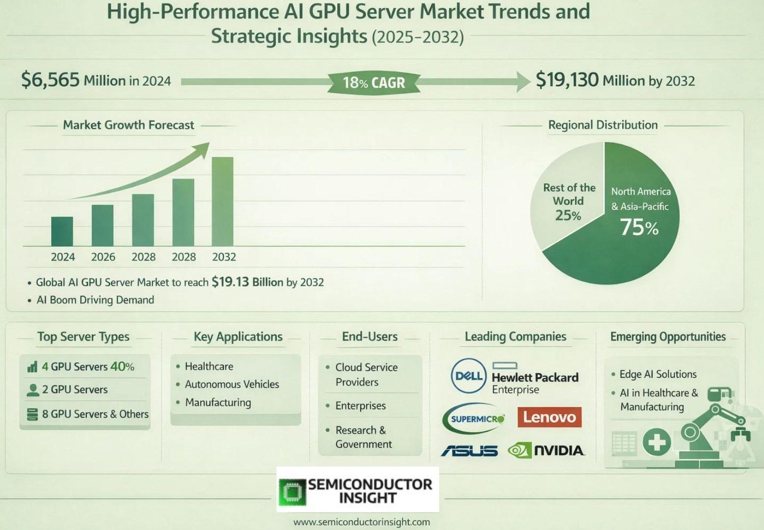 Global AI GPU Servers Market, valued at a robust US$ 6,565 million in 2024, is on a trajectory of remarkable expansion, projected to reach US$ 19,130 million by 2032. This growth, representing a compound annual growth rate (CAGR) of 18.0%, is detailed in a comprehensive new report published by Semiconductor Insight. The study highlights the indispensable role of these high-performance computing systems in accelerating artificial intelligence workloads across industries, from healthcare diagnostics to autonomous vehicle development.