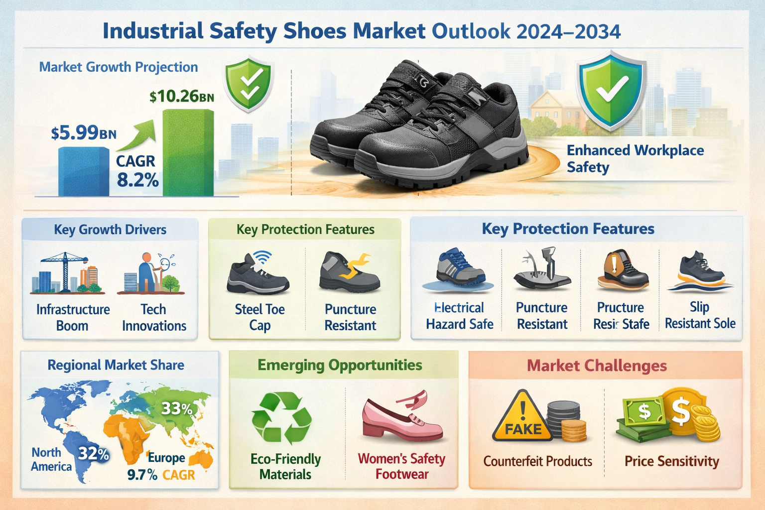 - Counterfeit Products - An estimated 18% of the market comprises non-compliant counterfeit safety shoes that compromise worker protection.