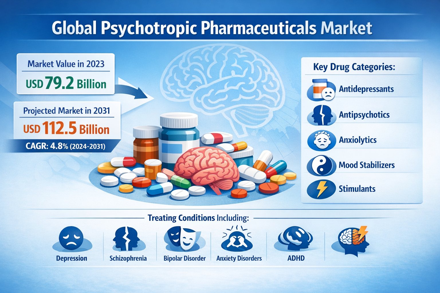 According to a newly published market research report by 24LifeSciences, global psychotropic pharmaceuticals market was valued at USD 79.2 billion in 2023 and is projected to reach USD 112.5 billion by 2031, growing at a compound annual growth rate (CAGR) of 4.8% during the forecast period 2024-2031.