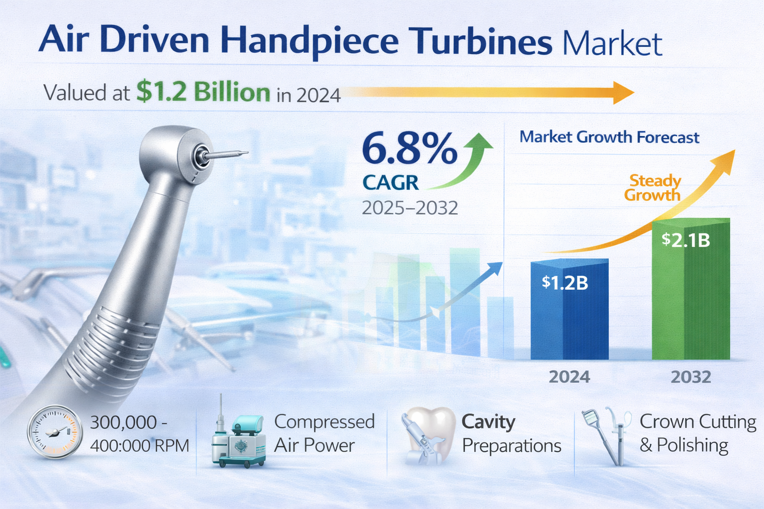 According to a newly published market research report by 24LifeSciences, global air driven handpiece turbines market was valued at USD 1.2 billion in 2024 and is projected to reach USD 2.1 billion by 2032, growing at a compound annual growth rate (CAGR) of 6.8% during the forecast period 2025-2032.