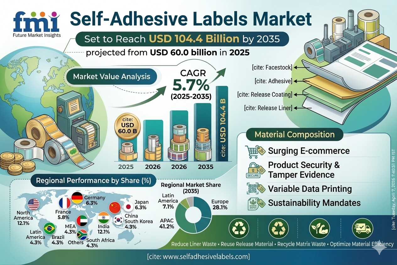 The self-adhesive labels market is projected to expand from USD 60.0 billion in 2025 to USD 104.4 billion by 2035, advancing at a 5.7% CAGR over the forecast period. Growth is being anchored by packaging, FMCG, pharmaceuticals, logistics, and retail e-commerce, where pressure-sensitive formats, linerless systems, and variable data workflows are embedded into high-speed operations. With barcode, batch coding, RFID traceability, and compliant inks increasingly integrated into labeling processes, the self-adhesive labels market continues to function as a strategic control point connecting packaging, warehousing, and retail checkout ecosystems.
