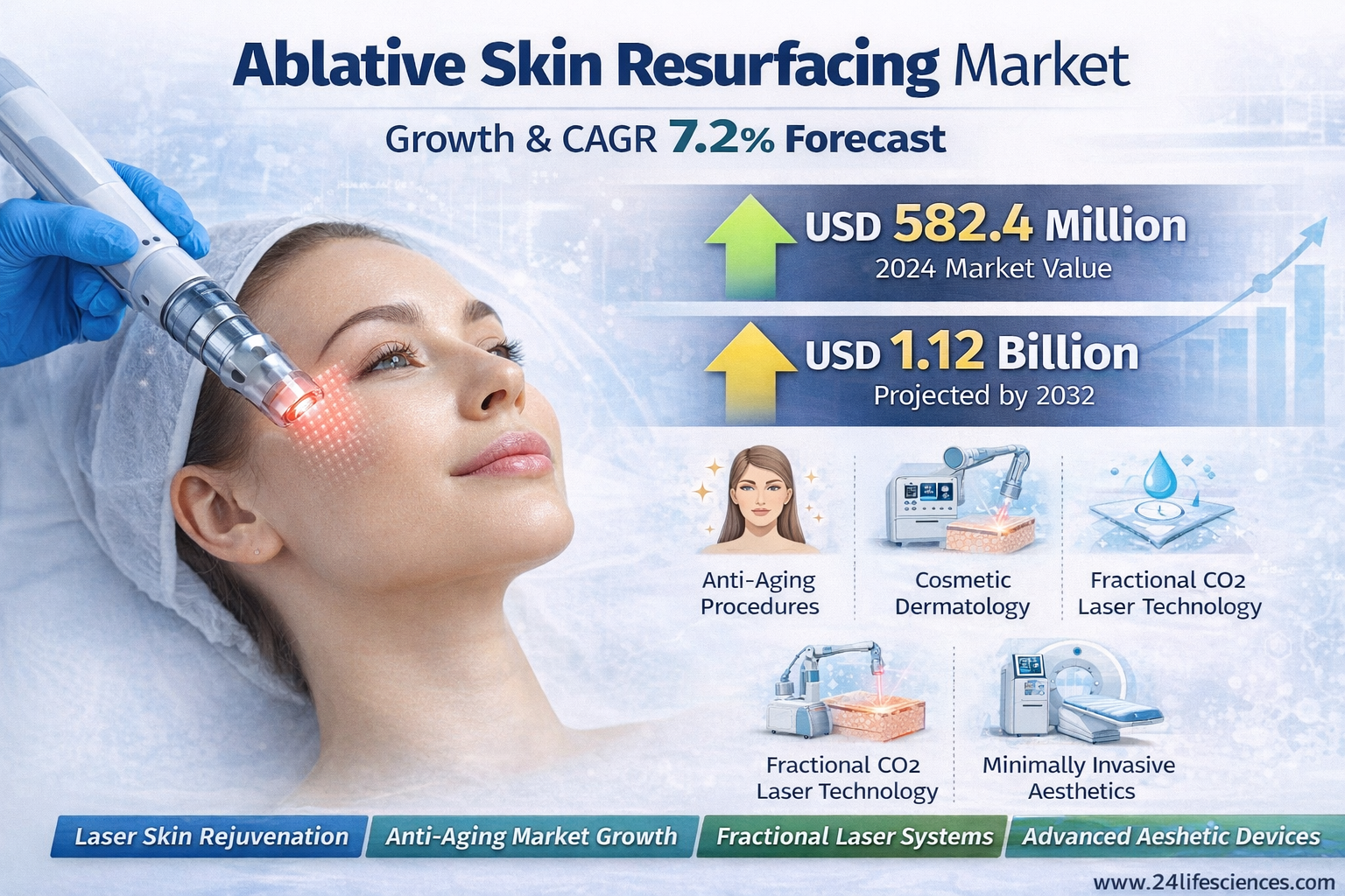 According to a newly published market research report by 24LifeSciences, global ablative skin resurfacing market was valued at USD 582.4 million in 2024 and is projected to reach USD 1.12 billion by 2032, growing at a compound annual growth rate (CAGR) of 7.2% during the forecast period 2025–2032.
