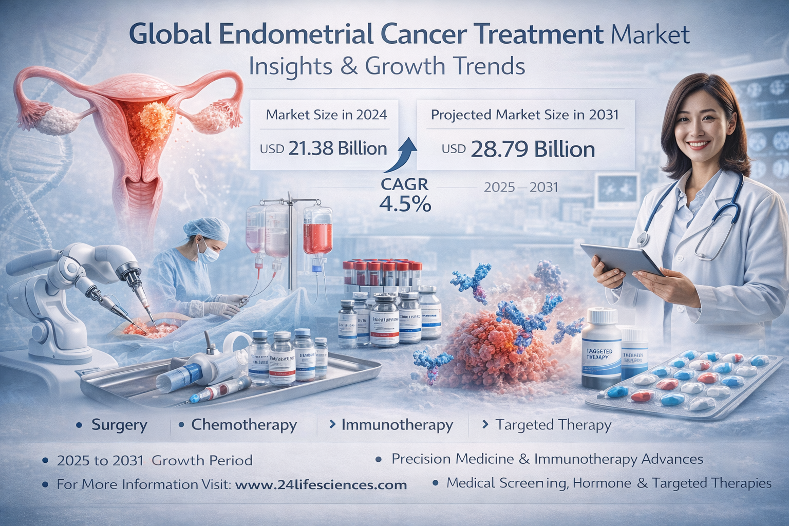 According to a newly published market research report by 24LifeSciences, global endometrial cancer treatment market was valued at USD 21,380 million in 2024 and is projected to reach USD 28,790 million by 2031, growing at a compound annual growth rate (CAGR) of 4.5% during the forecast period 2025–2031.