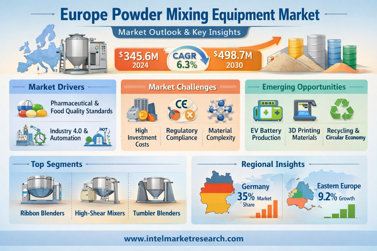 According to a new report from Intel Market Research, the Europe Powder Mixing Equipment Market was valued at USD 345.6 million in 2024 and is projected to reach USD 498.7 million by 2030, growing at a CAGR of 6.3% during the forecast period (2025-2030). This growth is driven by increasing industrial automation, stringent quality requirements in pharmaceuticals and food processing, and technological advancements in mixing technologies.