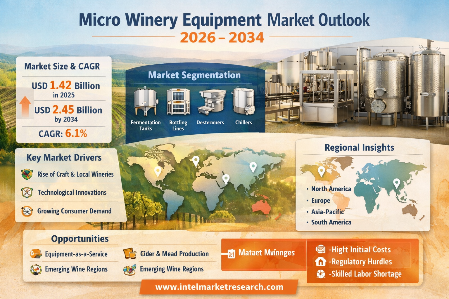 According to a new report from Intel Market Research, the global Micro Winery Equipment market was valued at USD 1.42 billion in 2025 and is projected to reach USD 2.45 billion by 2034, growing at a robust CAGR of 6.1% during the forecast period (2026–2034). This growth is propelled by the global surge in craft beverage culture, the rising number of boutique vineyards and urban wineries, and increasing consumer demand for locally-produced, high-quality wines with distinct terroir characteristics.