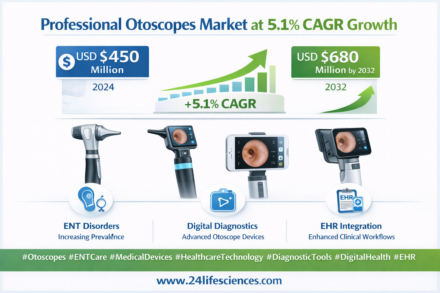 professional otoscopes market was valued at approximately USD 450 million in 2024 and is expected to reach USD 680 million by 2032, registering a CAGR of 5.1% during the forecast period. Professional otoscopes are essential diagnostic tools in ear, nose, and throat (ENT) care, making them critical for hospitals, clinics, and specialty practices. The market growth is propelled by rising prevalence of ENT disorders, increasing adoption of digital and video-enabled devices, and the integration of otoscopes with electronic health records (EHRs) for enhanced clinical workflows.