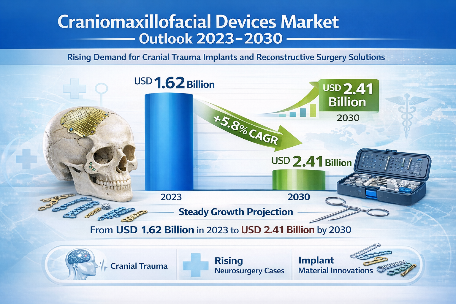 Craniomaxillofacial (CMF) devices market was valued at USD 1.62 billion in 2023 and is expected to reach USD 2.41 billion by 2030, expanding at a compound annual growth rate (CAGR) of 5.8% during the forecast period. The market’s growth is propelled by increasing incidences of cranial trauma, neurological disorders, and reconstructive surgeries, coupled with innovations in implant materials, patient-specific solutions, and minimally invasive surgical techniques. CMF devices are vital in neurosurgery, orthognathic surgery, plastic surgery, and ENT procedures, underscoring their significance in modern healthcare and life sciences.