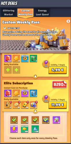 This guide breaks down every reward available from the recurring Hot Deals events and what to prioritize. \nGlittering Market — rotating cosmetic and premium bundles, often the best source for limited skins and vanity items; check for discounts and time-limited offers. \nCustom Weekly Pass — consistent weekly rewards like boost packs, small amounts of premium currency, and selectable items; buy when you want steady progression without chasing one big drop. \nSpecial Training Pass — focused on skill-up materials and rare upgrade items; ideal for players preparing a specific character or module for higher-tier content. \nDrone Training Pass — grants drone parts, blueprints, and enhancement chips; prioritize if your build relies on drone synergies or you need craftable components. \nHero Growth Pass — XP boosts, hero shards, and leveling materials that accelerate character development; best value when used during double-XP windows or new hero releases. \nQuick strategy tips — compare per-item cost across events, claim time-limited rewards first, and align purchases with your short-term goals (progression, cosmetics, or crafting). \nWatch the full walk-through to see exact contents and sample pulls for each event so you can plan purchases with confidence.