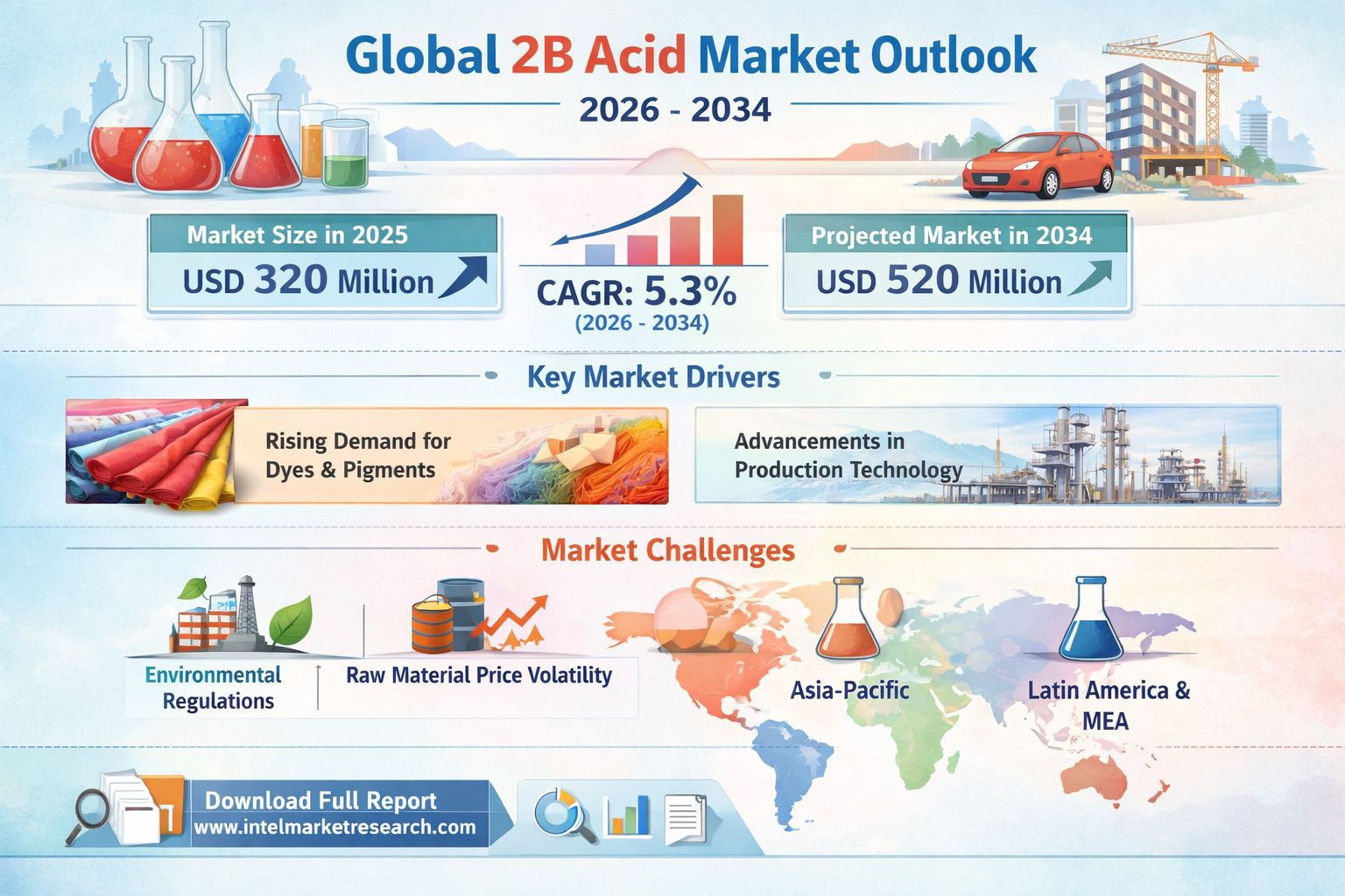 According to a new report from Intel Market Research, the global 2B Acid market was valued at USD 320 million in 2025 and is projected to reach USD 520 million by 2034, growing at a CAGR of 5.3% during the forecast period (2026–2034). This growth is propelled by increasing demand from end-use industries, particularly in emerging economies where construction and automotive sectors are expanding rapidly. Additionally, advancements in pigment technologies and stricter environmental regulations favoring high-performance colorants are contributing to market expansion.