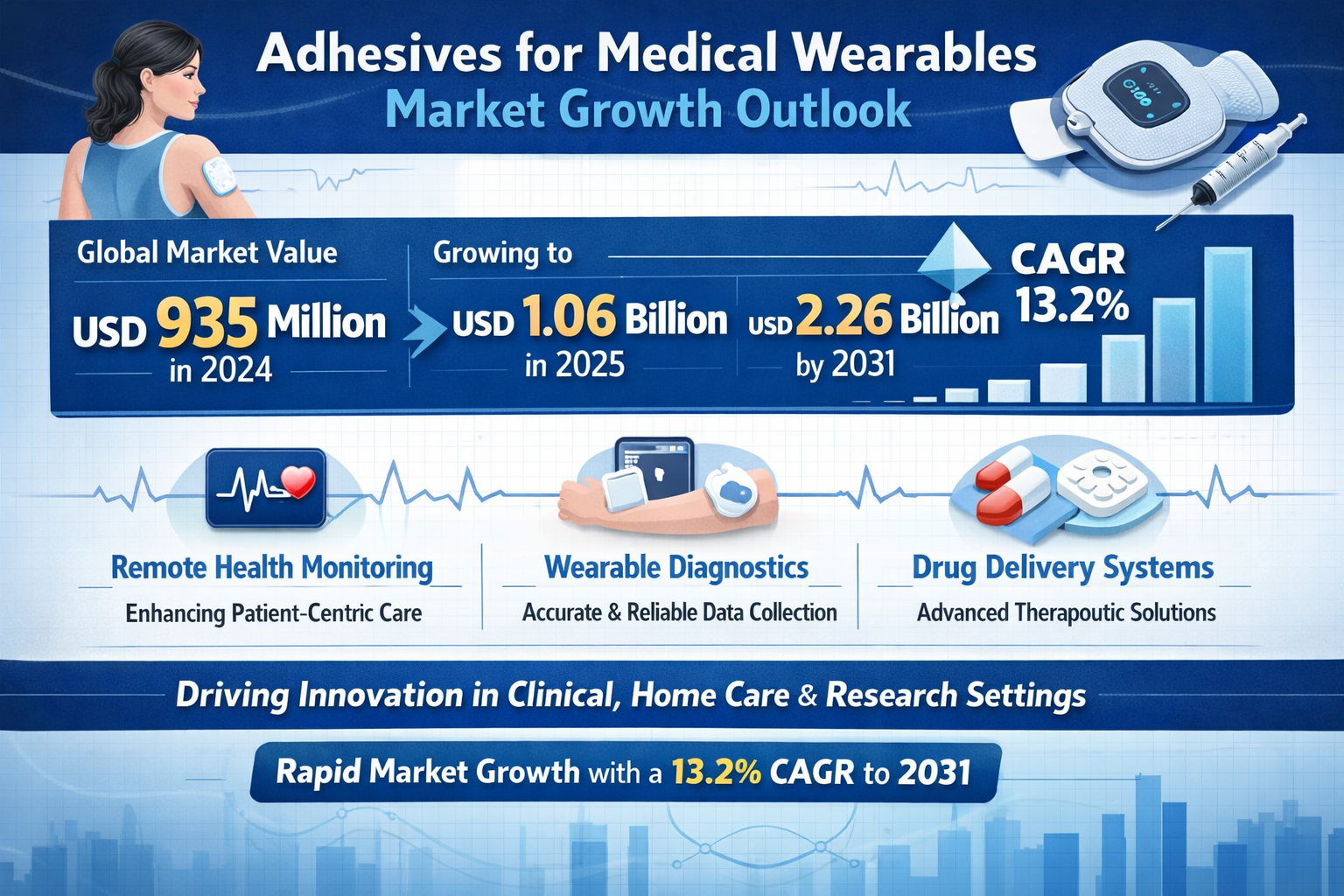 The Adhesives for Medical Wearables Market continues to experience strong momentum as digital health adoption accelerates worldwide. tcsn_3c2214e4d4388d851362daf72cfe606e.pngAccording to the latest research report, the global market was valued at USD 935 million in 2024 and is projected to grow from USD 1.06 billion in 2025 to USD 2.26 billion by 2031, registering a robust CAGR of 13.2% during the forecast period. This rapid expansion reflects the increasing integration of wearable medical technologies into mainstream healthcare, spanning monitoring devices, diagnostics, and drug delivery systems.