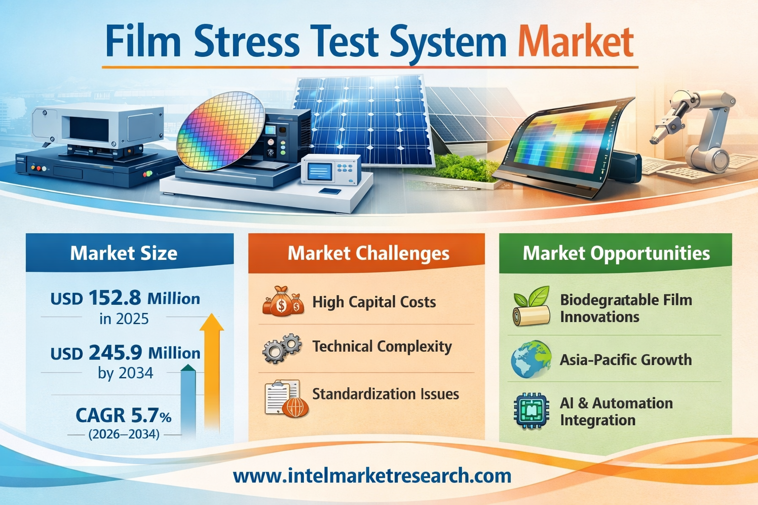 According to a new report from Intel Market Research, the global Film Stress Test System market was valued at USD 152.8 million in 2025 and is projected to reach USD 245.9 million by 2034, growing at a CAGR of 5.7% during the forecast period (2026–2034). This growth is propelled by increasing demand for high-performance thin films in advanced electronics and renewable energy applications, the semiconductor industry's expansion particularly in Asia-Pacific regions, and innovations in automated solutions integrating AI-driven analytics for real-time stress monitoring.