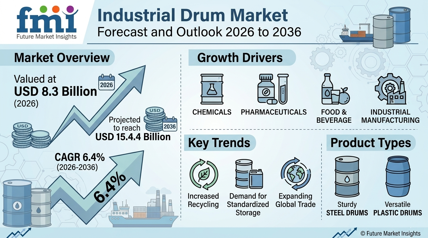 Global industrial drum market set to grow from USD 8.3B in 2026 to USD 15.4B by 2036 at 6.4% CAGR, driven by rising demand for safe bulk storage, regulatory compliance, and innovations in steel, plastic, and fiber drums across chemicals, pharma, and food industries.