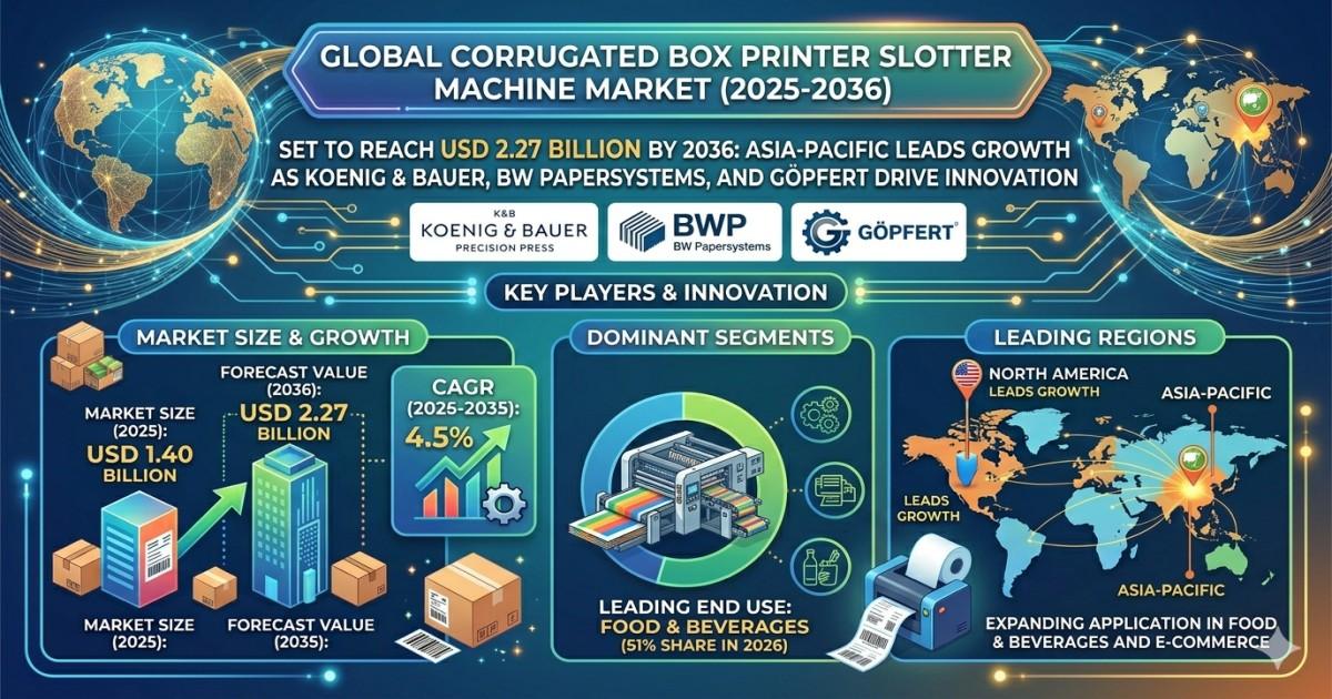 - Global Corrugated Box Printer Slotter Machine Market Set to Reach USD 2.27 Billion by 2036: Asia-Pacific Leads Growth as Koenig & Bauer, BW Papersystems.