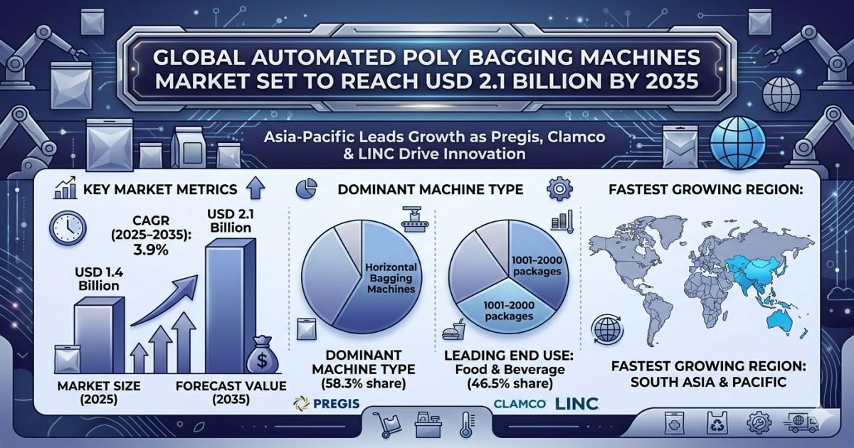 - Global Automated Poly Bagging Machines Market Set to Reach USD 2.1 Billion by 2035The global automated poly bagging machines market is experiencing steady growth, projected to expand from USD 1.4 billion in 2025 to USD 2.1 billion by 2035, registering a CAGR of 3.9% during the forecast periodhttps://www.futuremarketinsights.com/reports/automated-poly-bagging-machines-marketGlobal Automated Poly Bagging Machines Market Set to Reach USD 2.1 Billion by 2035The global automated poly bagging machines market is experiencing steady growth, projected to expand from USD 1.4 billion in 2025 to USD 2.1 billion by 2035, registering a CAGR of 3.9% during the forecast periodhttps://www.futuremarketinsights.com/reports/automated-poly-bagging-machines-market0 Commenti 0 condivisioni 135 Views