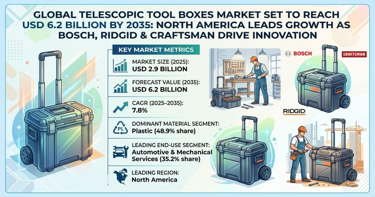Global Liquid Pouch Packing Machine Market Set to Reach USD 4.3 Billion by 2035: Asia-Pacific Leads Growth as VELTEKO, Sidsam & Holweg Weber Drive InnovationThe global telescopic tool boxes market is projected to grow from USD 2.9B in 2025 to USD 6.2B by 2035 at a 7.8% CAGR, driven by demand for portable, durable, and smart storage solutions across automotive, construction, and DIY sectors, with North America leading innovation and adoption.visit the official report page at: https://www.futuremarketinsights.com/reports/liquid-pouch-packing-machine-market